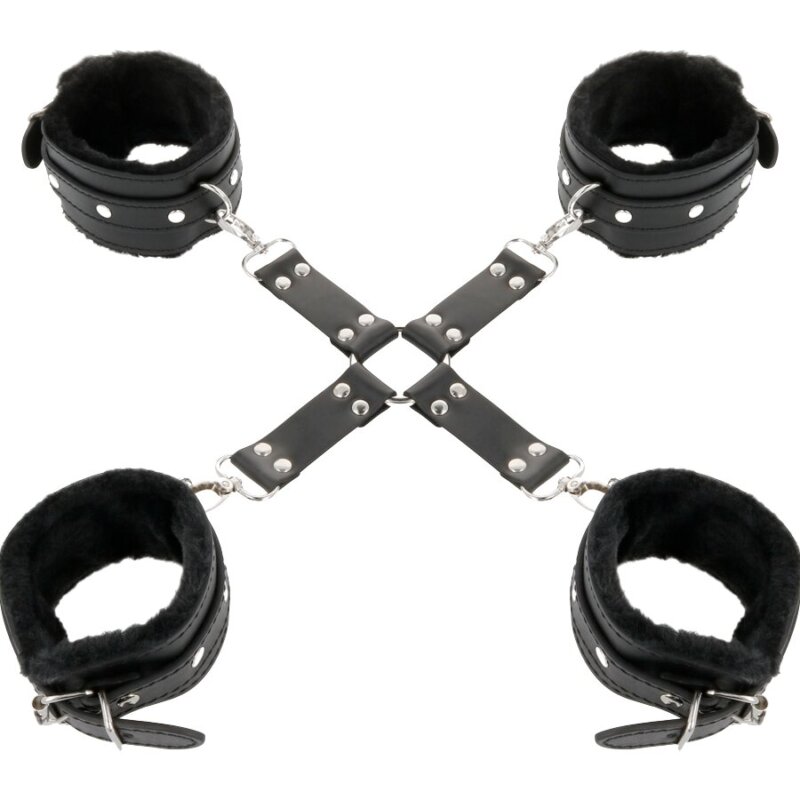 Esposas de cuero negro para pies y manos, ideales para juegos de restricción. Aumenta la pasión y la intimidad en tus encuentros.. Producto de Darkness, EAN: 8435565903985